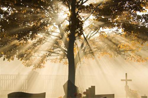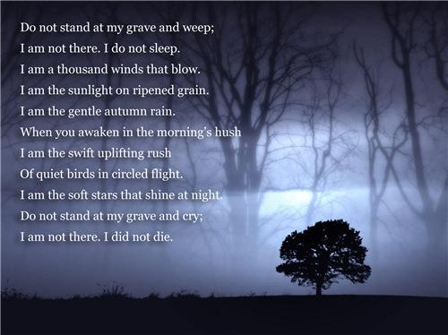 “Đừng đứng khóc lóc bên mồ em. Bởi em đâu còn dưới đó nữa. Em đang là ngàn gió bay cao trên đồng nội, là ánh dương quang lóng lánh giữa biển trời. Em đang tắm trong mưa thu mát dượi. Em đang trên cao, ngàn sao của giải ngân hà. Và một sáng mai kia, tiếng chim đánh thức anh. Thì hãy biết đó là tiếng em kêu anh. Thôi đừng khóc bên mồ em, chúng ta sẽ gặp lại nhau sau…”
